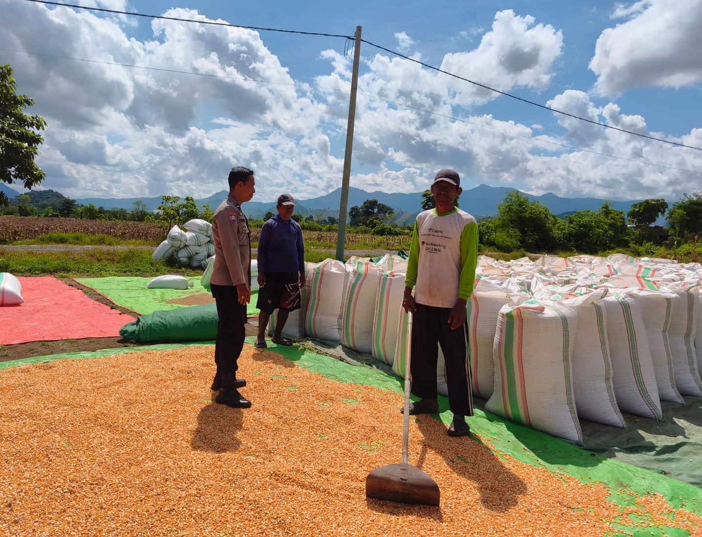 Dalam rangka mendukung Program Ketahanan Pangan Nasional menuju Indonesia Emas 2045, Bhabinkamtibmas (BKTM) Desa Jambu, Polsek Pajo, AIPDA Roni Febriadi melaksanakan kegiatan pemantauan proses penjemuran dan pengepakan jagung milik warga binaannya di So Wadu Jao, Desa Jambu, Kecamatan Pajo, Kabupaten Dompu, pada Senin (13/04/2026) pukul 10.30 WITA hingga selesai.