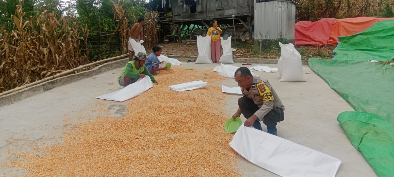 Kapolres Bima Kota AKBP Mubiarto, S.I.K., M.M., melalui Kasi Humas Ipda Baiq Fitria Ningsih menjelaskan bahwa Bhabinkamtibmas Kelurahan Lelamase melaksanakan pemantauan langsung terhadap proses penjemuran jagung warga hasil panen di So Rida Rombo.